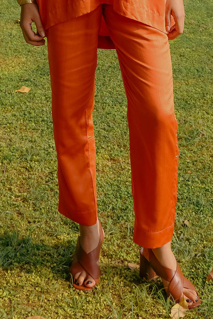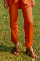 The Kesar Dhara Bottoms, crafted from lotus fiber, offer luxurious comfort with a refined, water-repellent design. Their saffron orange tone and relaxed fit provide an elegant, nature-inspired look, perfect for any occasion.