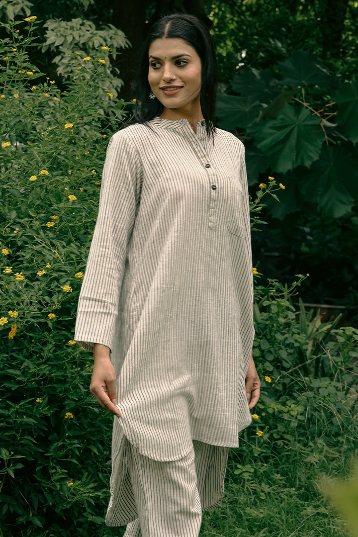 Greet the day in the Mandvi Savar Kurta, where the warmth of sunrise meets timeless style. Crafted from the finest Kala Cotton in a one-of-a-kind stripe weave, this kurta radiates with the hues of dawn along the Mandvi shores. Tailored for both elegance and comfort, it offers a luxurious feel with every wear, perfect for both morning affairs or leisurely evenings.