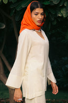 Indulge in the sublime comfort of the Ivory Whisper Silk Top, crafted from 100% cruelty-free Eri Silk. Known for its ethical production process that does not harm silkworms, this elegant ivory top offers a tranquil yet sophisticated presence. Soft, breathable, and hypoallergenic, it drapes effortlessly, ensuring understated elegance.